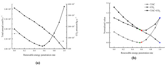 Variations of total annual cost and carbon dioxide emissions of the HES with renewable energy penetration rate. (a) Variations of the total annual cost and carbon dioxide emissions with renewable energy penetration rate, (b) Variations of normalized total annual cost and normalized carbon dioxide emissions with renewable energy penetration rate.