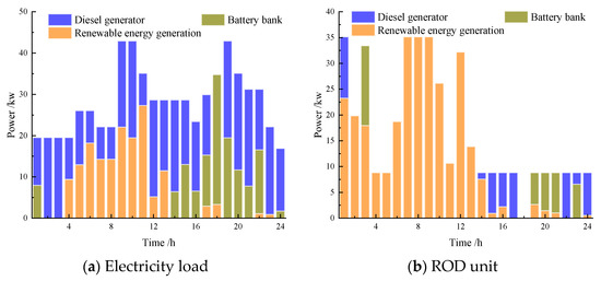 By solving the proposed mathematical model, the operating scheme of the HES with multiple types of storage devices for powering the ROD unit with the lowest total annual cost can also be obtained by satisfying requirement of the renewable energy penetration rate (namely 0.8 in this example). The power scheduling schemes of the electricity load and the ROD unit at the first month are taken as examples to illustrate the operating scheme of the proposed system, as shown in Figure 6.