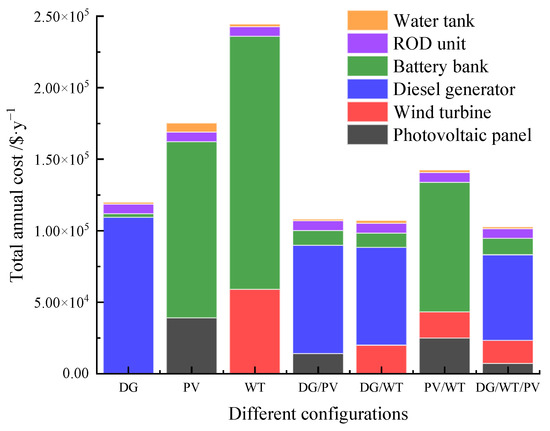 In this case study, the lowest allowable value of the renewable energy penetration rate is 0.8 of the HES. By solving the proposed mathematical optimization model, the minimum total annual cost and the corresponding capacity configuration scheme of the HES with multiple types of storage devices for supplying the ROD unit can be obtained. The optimal results with the minimum total annual cost of the HES are listed in Table 2, and the cost composition of the system is described in Figure 4.
