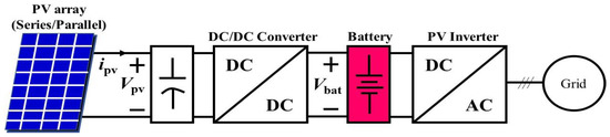 Here, Vo is the DC-DC output DC voltage, and idc is the current of the grid inverter. The power converter’s (DC-DC) output voltage can be expressed as a function of input voltage Vpv and converter switch duty ratio D. L represents an inductor of BC, and Cout represents the output filter capacitor.