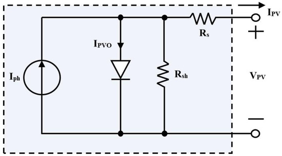 where Rs and Rsh are the series and shunt resistors, respectively; Iph is the photocurrent of the PV cell; A is the p-n ideality factor; IPVO is the reverse saturation current; K is the Boltzmann constant (1.38 × 10−23 J/K); q is the electronic charge (1.602 × 10−19 C); T is the temperature of the cell (in Kelvin).