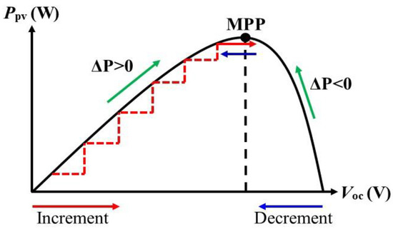 Because the general MPPT method is simple and easy to implement, it is currently applied in multiple areas in the industry. The most applied P&O algorithm changes the output power (ΔP) of the solar panel and changes the operating position appropriately through voltage increments (ΔV) in Figure 3. The red line in Figure 3 is an increasing voltage and the blue line is a decreasing voltage. That is, the maximum power point is found by changing the step up to the maximum power point (MPP). The ratio of the change in power (P) to voltage (V) is considered the duty ratio, D, which is the slope of each operating point over a short sampling time. That is, when the magnitude of the voltage increment increased, a fast response can be obtained, but the stability of the steady state is reduced. Conversely, when the magnitude of the voltage increment decreases, a fast response cannot be ob-tained. P&O methods must overcome these limitations.