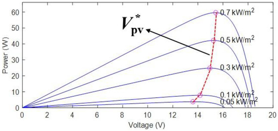 The proposed algorithm predicts illuminance by composing a deep-learning model based on the solar panel voltage and current. Long short-term memory (LSTM) was applied to the deep learning algorithm used in this study, and learning was performed on training datasets of PV voltage and current according to irradiation changes. Based on the predicted illuminance, the solar power generation’s reference voltage that follows the maximum output point can be calculated. Figure 5 shows the change in the maximum output point according to the change in irradiation. That is, the proposed method can calculate the solar power generation reference voltage and obtain the maximum output point from the amount of irradiation based on the predicted illuminance.