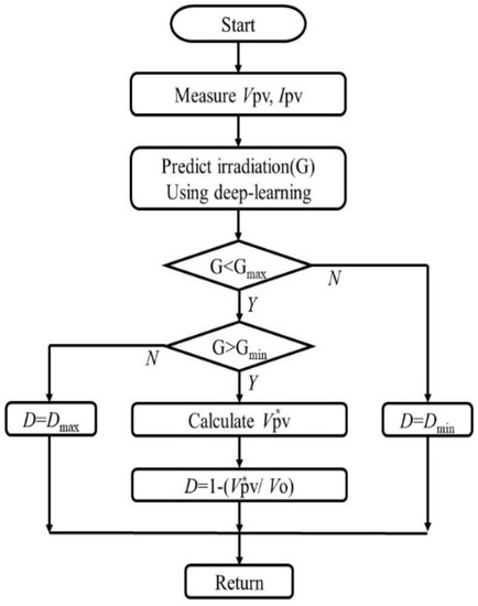 The proposed method based on the calculated duty ratio has the advantage of being able to accurately follow the maximum output point even if the amount of irradiation changes and it is able to quickly follow the maximum output point. It can mitigate disadvantages of the widely used P&O method: steady-state voltage ripple and slow tracking speeds of the transients. Figure 6 shows a flowchart of the proposed algorithm.