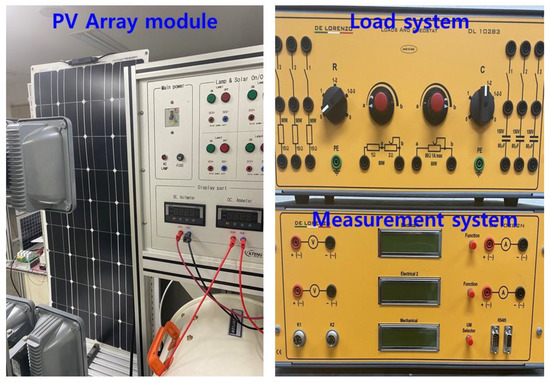 Experimental data obtained using the DFSP-100M model of DOKIO were used as training data. Figure 7 shows images of the experimental setup, including the solar panel, load system, and instrumentation used in this study. Table 1 lists the specifications of the solar panels used in this study. The generated voltage and current of the solar power generation system were used. Based on this, a survey to follow the maximum output point was predicted. Because the output power generation voltage and current are directly affected by irradiation, the voltage and current of the solar power generation system were used when constructing the deep learning neural network.