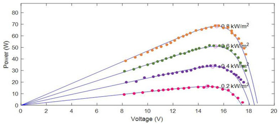 Irradiation data were obtained by measuring the voltage and current of the PV system while changing the amount of irradiation (200, 400, 600, and 800 W/m2). The values of the measured data were interpolated using linear interpolation and extrapolation. For survey data that could not be obtained via experiments, additional data were derived using MATLAB/Simulink PV module blocks based on the specifications presented in Table 1. In addition, the derived data verified the validity of the data by directly comparing them with the experimental data. Figure 8 shows the data obtained during the experiment. The solid line in Figure 8 represents the simulation result, and the dot represents the experimental result.