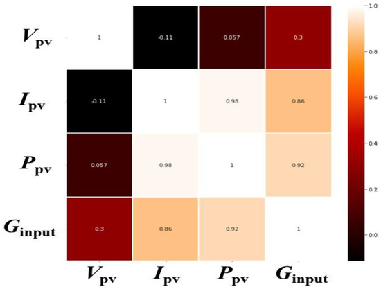 Figure 9 shows the results of the correlation analysis between the data for the deep-learning model. The closer the number is to 1, the higher the correlation; the closer it is to 0, the lower the correlation. In addition, the closer the color is to white, the higher the correlation, and the closer the color is to black, the lower the correlation. The deep learning model uses the output voltage, current, and power of the PV system as input data and provides the input illuminance as the prediction result.