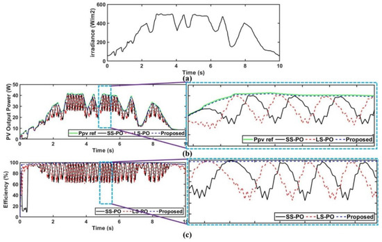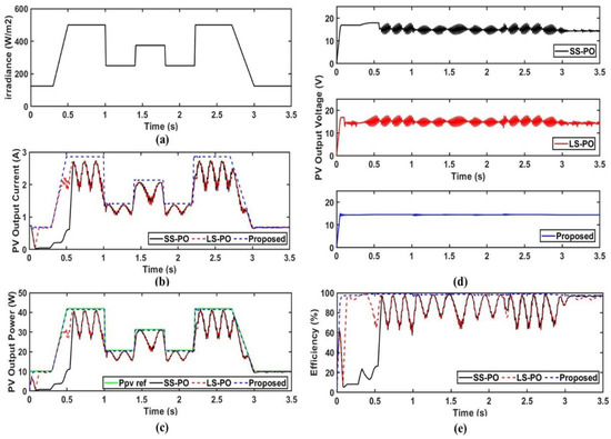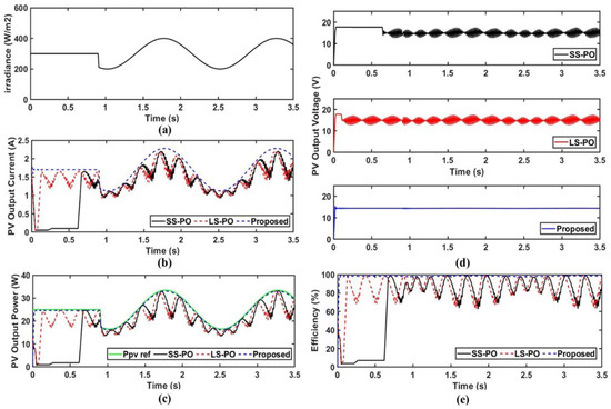 The result of Figure 11a is congested with abrupt and gentle changes in the changing illuminance profile. The performance of the proposed method was evaluated under these conditions. The proposed method showed superior tracking performance than existing methods (LS-PO SS-PO). It showed the same results for output, efficiency, and voltage/current. Clearly, the algorithm proposed in Figure 11b,c provides steady-state oscillations of low power/current and small stabilization time compared to the conventional method. In addition, as shown in Figure 11d, the proposed method exhibits steady-state oscillations of low voltage, whereas the existing SS-PO strategy and LS-PO technology exhibit high steady-state oscillations. Therefore, the proposed algorithm exhibits a faster response and lower steady-state oscillation than the LS-PO and SS-PO. Regarding the performance improvement, the proposed method, as shown in Figure 11e, showed a high value with an average efficiency of 98.4% due to the low steady-state vibration. Meanwhile, the SS-PO algorithm shows an improved efficiency in the steady state but a significant decrease in efficiency in the transient state due to slow operations (86.1%). The LS-PO algorithm increased efficiencies under transient conditions due to its fast operation but decreased efficiencies under steady-state conditions (85.9%). In conclusion, the proposed algorithm shows improved tracking efficiency in transient and steady-state conditions, increased MPPT speed, and reduced steady-state oscillations.