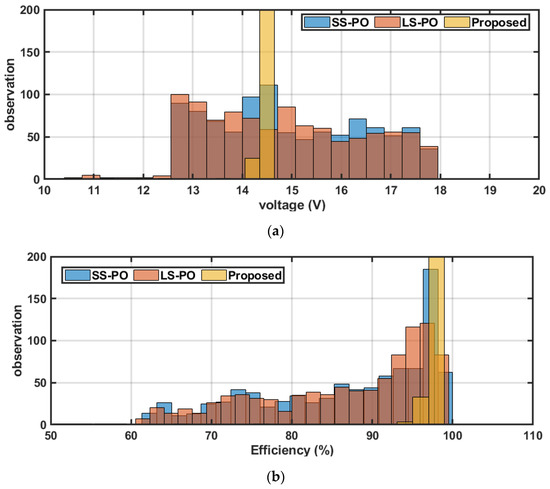 Histogram of PV results: (a) PV output voltage and (b) system-tracking efficiency.