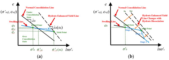 Herein, the initial stress state of the sediment is (σ′v0, e0), and it has a stress-history-dependent yield stress state of (σ′yi, eyi) when the sediment had no hydrate, as shown in Figure 2a. Along the recompression line, the following relationship holds