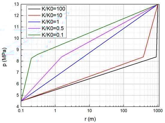 Figure 3 shows the meaning of the notations in Equation (17). The blue solid line describes the pore-pressure distribution in the formations when considering soil compaction. The red dash line represents the pore-pressure distribution in the formations without the consideration of soil compaction. In the steady state analysis, this distribution is related to the ratio of the permeability of the hydrate-dissociated zone to the permeability of the undissociated zone.