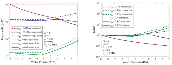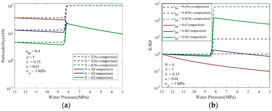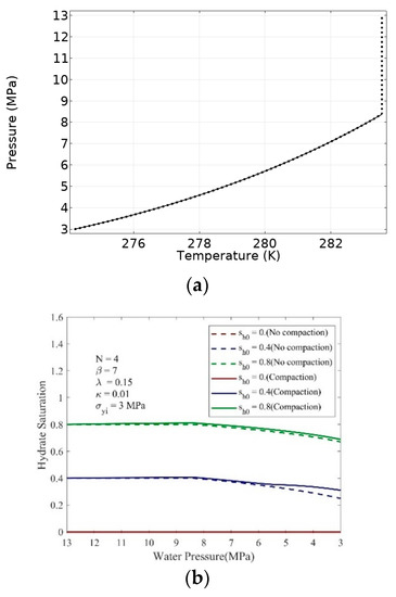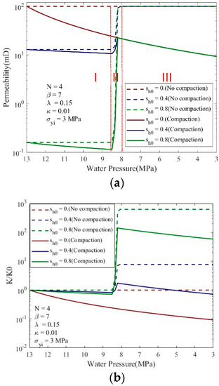 In this scenario, the temperature remains at its initial value T0 = 283.56 K. The hydrate dissociates when the pressure becomes equal to the phase equilibrium pressure of 8.38 Mpa at this given temperature. Figure 5a shows the changes in permeability, whereas Figure 5b shows the changes in the permeability ratio. Three different initial hydrate saturations (sh = 0, 0.4 and 0.8) are considered. The model parameters are N = 4, β = 7, λ = 0.15, κ = 0.01 and σ′y = 3 Mpa (normally consolidated). Results are shown for the cases with and without the soil compaction effect.