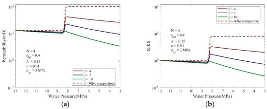 The effect of parameter β on (a) permeability and (b) permeability ratio.
