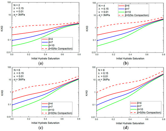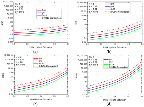The effect of parameter β on the relationship between permeability ratio K/K0 and initial hydrate saturation when (a) N = 2, (b) N = 4, (c) N = 6 and (d) N = 8 in the case of constant temperature.