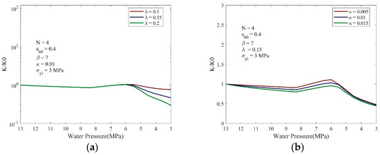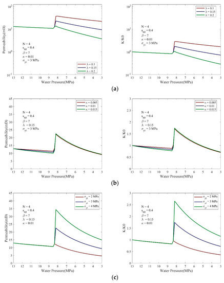 The impact of different parameters including (a) parameter λ, (b) parameter κ and (c) precondition pressure σy on permeability (Left figures—permeability, Right figures—permeability ratio).