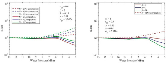 The effect of parameters N and β on permeability ratio K/K0 (Left figures—N, Right figures—β).