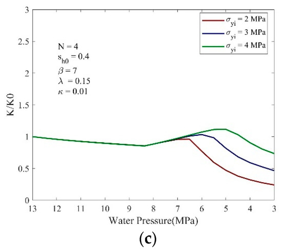 As shown by Equation (30), there are eight parameters that relate compaction and hydrate dissociation to permeability. The initial intrinsic permeability of the host sediment Ks0 is set to be 100 millidarcies. The initial porosity n0 is 0.418. The parameters a and b equal 20.1 and 1, respectively, provided by Uchida et al. [53]. Different values of initial hydrate saturation sh0 (0, 0.4 and 0.8) are chosen in the range of the real test data obtained from HBS samples obtained from the Nankai Trough site [53].