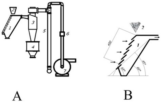 Layout of the laboratory tailings screening equipment (A) pitched curtain air classifier design (B): 1—air classifier; 2—material feeder; 3—air cyclone; 4—fine particle collector; 5—hose filter; 6—flowmeter; 7—high pressure ventilator.