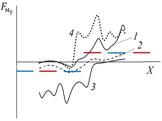 Distribution of (1–4) force vertically applied to magnetite particle in the system with two separators. Horizontal line segments show location of 24 mm wide and 20 mm high magnets with colors indicating their polarities. The distance between the magnets is 30 mm.