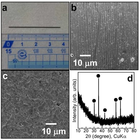 Information on the substrate used in the present work: (a) Photograph of the substrate; (b): SEM image of the substrate surface obtained by dicing; (c) SEM image of the substrate surface obtained by slicing; and (d) XRD pattern of the substrate (●: Fe3O4).