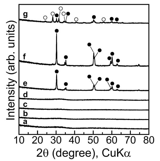 XRD patterns of sol–gel products (a) as-prepared and annealed at (b) 100, (c) 200, (d) 300, (e) 400, (f) 500, and (g) 600 °C. ●: t-ZrO2, 〇: m-ZrO2.