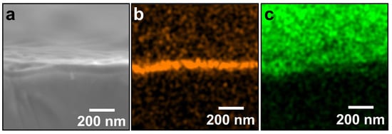 SE image and corresponding EDX elemental analysis of SiO2/ZrO2-coated substrates. Both SiO2- and ZrO2-coating processes were carried out three times. (a) SE image; and (b) and (c) elemental maps of Si (orange) and Zr (green), respectively. The sample was the same as that in Figure 5(b2).