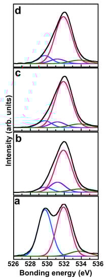 O 1s XPS spectra of surfaces of SiO2/ZrO2-coated substrates. The black curves are the measured spectra. The numbers of etches are 0, 1, 2, and 3 for spectra (a–d), respectively. Each measured spectrum is fitted with Gaussian peaks, giving binding energies of 529.7 eV (blue curve), 531.2 eV (purple curve), 531.9 eV (red curve), and 533.8 eV (green curve), attributed to the O atoms of Zr–O, Si–O–Zr, Si–O, and Si–OH, respectively. The as-prepared sample was the same as that in Figure 5(b1).