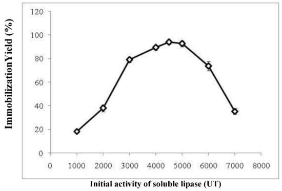 Yields of immobilized B. stearothermophilus lipase determined using different initial lipase amounts. Enzyme activity was measured using an olive oil emulsion at pH 12 and 60 °C. Data are expressed as the mean ± standard deviation of triplicate measurements.