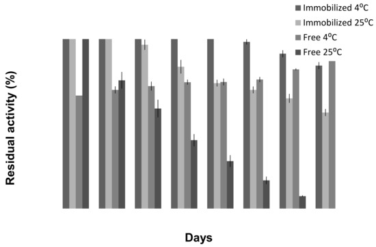 Storage stability is considered the most important property for industrial applications, and it has been well established that immobilized lipases have better storage stability than free lipases [16,17,18]. The current study showed that after 60 days of storage at 4 °C, the relative activity of immobilized B. stearothermophilus lipase was over 98% of the initial activity prior to storage, while free lipase exhibited approximately 75% of its initial activity after storage (Figure 3). Interestingly, even after storage at 25 °C for 20 days, immobilized B. stearothermophilus lipase was fully active compared to free lipase, where only 50% of initial activity was retained.