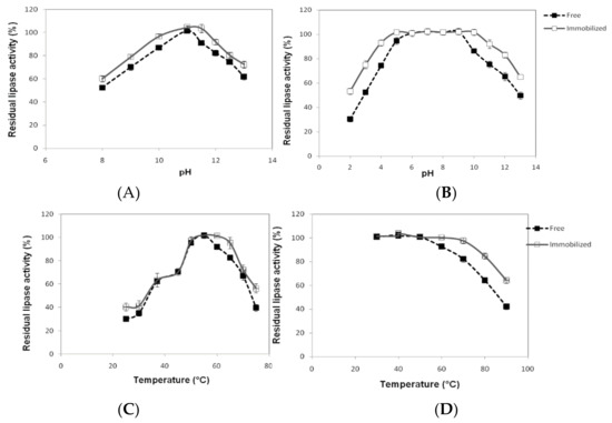 First, lipolytic activity was measured at 60 °C at pH values ranging from 8 to 13. The pH stability of immobilized lipase was investigated by incubating the lipase preparation for 48 h at room temperature and using appropriate buffers to test the pH from 2–13. Residual lipase activity was measured after centrifugation using the standard assay method. The measurements were performed in triplicate. Second, the activities of the immobilized and free enzymes were measured from 25 to 75 °C at pH 12. Finally, thermostability was explored at temperatures ranging from 30 to 90 °C at pH 12 after a 1 h incubation. Residual activity was measured after centrifugation of each preparation.