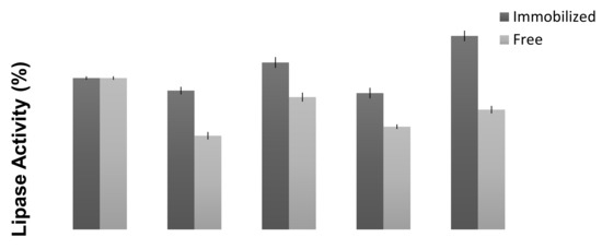 The effect of substrate type on free and immobilized B. stearothermophilus lipase activity is presented in Figure 5. Free and immobilized lipase hydrolyzed all of the selected commercial oils, revealing the potential of these lipases in the biodegradation of oil-rich wastewater. When olive oil was tested, no significant differences were observed between the activities of immobilized or free lipases. Interestingly, immobilized lipase activity was greater than free lipase activity when palm, corn seed, sunflower, and coconut oil were used as substrates (Figure 5). When compared with olive oil (100%), CaCO3-immobilized lipase exhibited a preference for coconut oil (128%), followed by corn seed oil (111%), and sunflower and palm oils (92%).