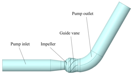 The oblique flow pump is widely used in farmland irrigation and drainage, water transfer engineering, thermal power generation, and other fields because of its advantages of good cavitation resistance, wide efficiency area, compact structure, and convenient start-up [1,2]. The coherent action between the inlet flow of the impeller and the rotating flow field of the impeller, the dynamic and static interference between the outlet fluid of the impeller and the guide vane, the rotating stall and cavitation of the guide vane, and other unstable flow factors are easy to cause pump vibration and noise, which will not only affect the operation stability of the unit [3,4] but also destroy the environment and affect people’s health. To improve the stability of pump operation and optimize the operating environment, it is necessary to study the flow-induced noise characteristics of oblique flow pumps.
