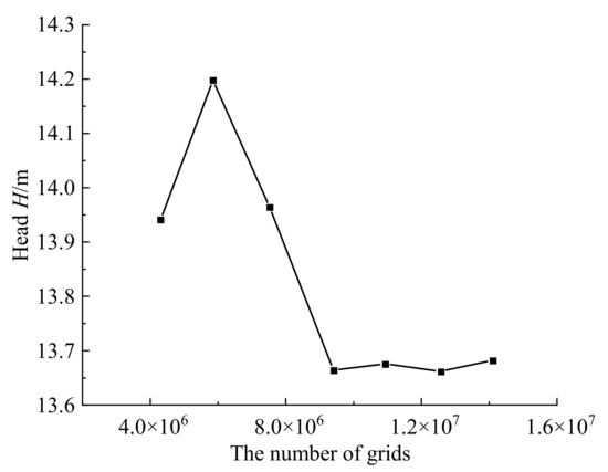 In this paper, ANSYS Mesh software is used to divide the computational domain into grids, and the grid type is selected as a hybrid grid. To better simulate the flow near the wall, a boundary layer grid is used in the near-wall region, and the average y+ value in the near-wall region is controlled within 100 by local encryption of key parts such as blades. The specific division is shown in Figure 2 [22]. The grid independence of an oblique flow pump under optimal working condition and steady flow is verified as shown in Figure 3 [22], and the total number of grids in the fluid domain is finally determined to be 11.09 million.