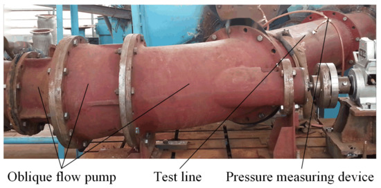 The performance test of the oblique flow pump was carried out on the multifunctional pump model and device model test bench at the National Pumps Research Center of Jiangsu University. The installation of the test device system is shown in Figure 4 [22]. The flow rate of the test device is measured by an intelligent electromagnetic flowmeter, and the measurement accuracy is better than ±0.2%; The head is measured by installing a differential pressure transmitter on the device. The type of differential pressure transmitter is a WT2000DP5S intelligent differential pressure transmitter, and the measurement uncertainty is better than ±0.1%. The torque and speed are measured by ZJYW1/ZJ500Nm intelligent torque and speed sensor, and the accuracy is better than ±0.1%. When the sensor is used, it only bears torque and does not bear other external forces.