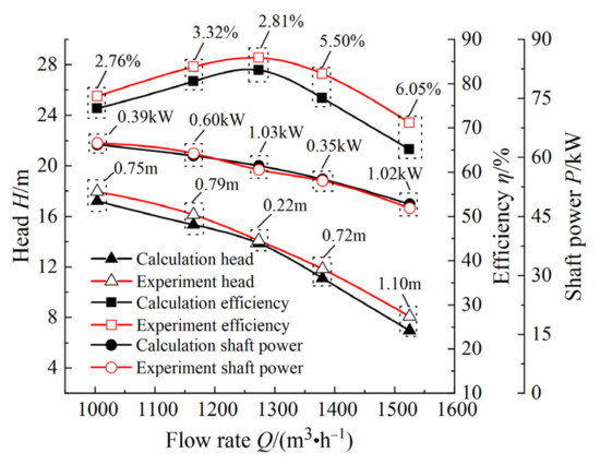 The comparison curve between the experimental external characteristic results and the numerical simulation results is shown in Figure 5 [22]. It can be seen from the curve in the figure that the trend of numerical calculation results is basically consistent with the experimental measurement results, and the shaft power simulated by numerical calculation is consistent with the experimental measurement values. In the optimal and adjacent conditions, the numerical simulation efficiency and head curves fit well with the test values, while in the partial flow conditions, the numerical simulation head and efficiency are smaller than the test values. Under the optimal working condition, the errors of the head, efficiency, and shaft power between numerical calculation and experimental measurement are 1.5%, 3.2%, and 1.8%, which shows that the numerical calculation method adopted has high accuracy and meets the research requirements.