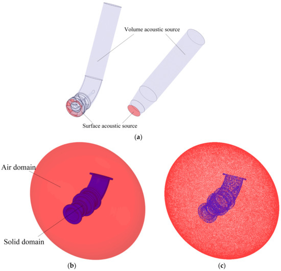 Acoustic calculation settings: (a) Flow noise calculation domain and sound source; (b) Radiation noise calculation domain; (c) Mesh of radiation noise calculation domain.