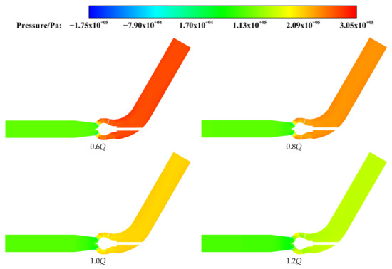 To study the influence of different flow conditions on the pressure field of the whole flow channel of an oblique flow pump, the meridian surface of the flow channel is selected as the research object, and the pressure distribution on the meridian surface is analyzed, as shown in Figure 7. It can be seen from the figure that the pressure in the inlet section is the smallest and the distribution is the most uniform. After the fluid enters the impeller, the pressure increases sharply. With the increase in flow rate, the overall pressure in the flow channel decreases, the pressure distribution gradually tends to be uniform, and the distribution is the most uniform at the optimal working point. The more the flow rate deviates from the optimal operating point, the greater the pressure difference between the impeller inlet and outlet, the more complex the flow in the flow field, and the greater the energy loss.