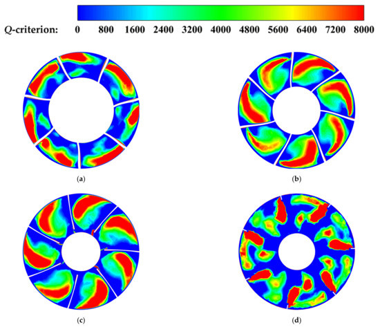 Furthermore, the vorticity distribution of a guide vane under small flow conditions is studied, and the section of each position of a guide vane under 0.6Q is selected as the research object. Figure 10 shows the vorticity distribution at one-third, two-thirds, five-sixths, and the outlet of the guide vane, respectively. The vorticity at the one-third section of the guide vane is mainly distributed in the rim and near the blade, in which the high-energy vortex is near the pressure surface of the blade and extends into the channel, and the medium-energy vorticity is distributed at the hub. With the fluid movement, at the two-third section of the guide vane, the high-energy vortex region concentrates on the pressure surface of the vane and near the rim, and the vorticity region almost spreads all over the channel and uniformly distributes in seven channels, gradually blocking the channels. In the five-sixths section of the guide vane, the vorticity intensity is further enhanced, and the distribution area is further expanded. At the same time, the vorticity attached to the blade ends, and blades shredded with the flow. The vortex shedding at the exit of the guide vane and the trailing edge of the blade merge with the vortex area in the channel to form seven vorticity areas. Although the vortex area in the channel becomes smaller, it still contains a high-energy vortex, which shows that the vortex generated in the channel is not easy to dissipate.