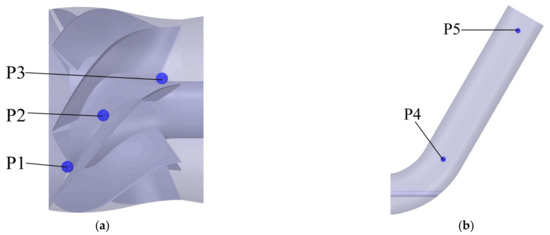Schematic diagram of monitoring points. (a) Monitoring points in guide vane; (b) Monitoring points in outlet.