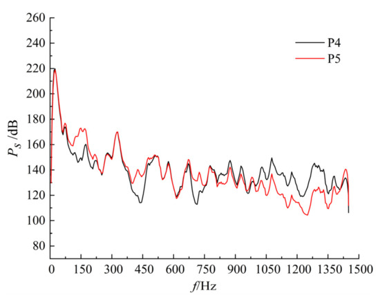The frequency domain characteristics of sound pressure at different positions in the exit area are studied. As shown in Figure 13b, two monitoring points are set in the outlet pipe along the flow direction. The frequency domain distribution of monitoring points under optimal working conditions is studied. The frequency domain distribution characteristics of the two monitoring points are compared and analyzed. It can be seen from Figure 15 that the maximum peaks of two points appear at the axial frequency. The spectrum diagram in Figure 15 is filtered. In the first half of the spectrum, the sound pressure intensity at the P5 point is higher than that at the P4 point. In the second half of the spectrum, the result is just the opposite.