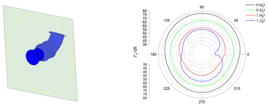 To check the directional distribution and radiation level of flow-induced radiated noise of the oblique flow pump, it is necessary to set up monitoring points around the pump. On the radial plane, a circle of monitoring points is uniformly set with a radius of 1 m from the outer wall of the pump. To close the acoustic pointing curve, a total of 61 monitoring points are set, as shown in Figure 16. In Figure 16, the sound pressure radiation level of the external sound field under different flow conditions at the blade frequency is analyzed. It can be seen from the figure that due to the unified scale, the sound pressure distribution in the radial plane of small flow conditions presents an approximate circle shape, and in fact, all flow conditions can show obvious dipole characteristics. With the increase in flow rate, the radiation level of sound pressure increases, showing low radiation levels under large flow rates and high radiation levels under small flow rates. It can be seen that the unsteady flow under the condition of a small flow rate will also have a great influence on the radiated noise of the pump.