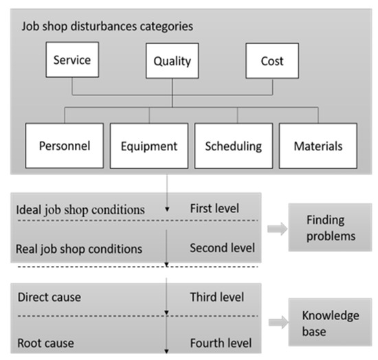 - Finding problems: after defining job shop disturbance, finding problems or symptoms in real job shop conditions that differ from ideal job shop conditions becomes the first phase which contains two levels. At the first level, ideal job shop conditions are listed according to the definition to build an ideal job shop that no disturbances will happen, and all activities will remain in their course. Then, at the second level, the actual job shop conditions are established accordingly to reflect the phenomenon that disturbances may happen anywhere at any time. Any actual job shop conditions that are not under the ideal job shop conditions will be considered the so-called disturbance trigger conditions affecting the job shop.