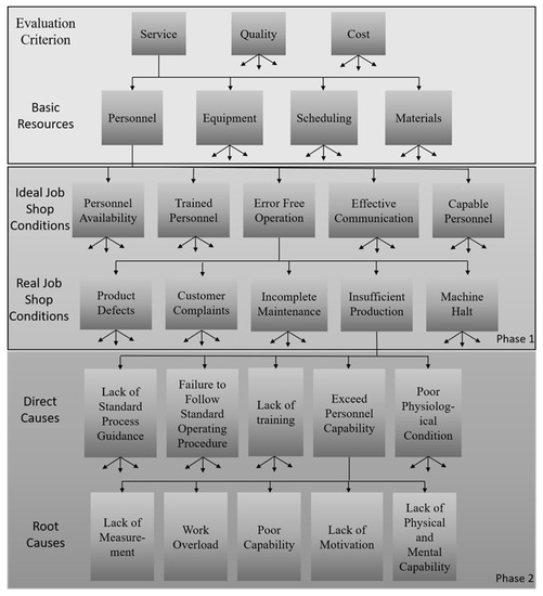 It can be seen from Figure 2 that based on the criteria of service, personnel in ideal job shop state are shown as available, capable, trained, error free operation, and effective communication. However, in the actual environment, what is opposite to error-free operation is the phenomenon of product defects, customer complaints, incomplete maintenance, insufficient production, and machine halt. Among them, taking the insufficient production as an example, the direct causes include lack of standard process guidance, failure to follow SOP, and lack of training. The root causes of exceeding personal capability include work overload, poor capability, lack of motivation, etc.