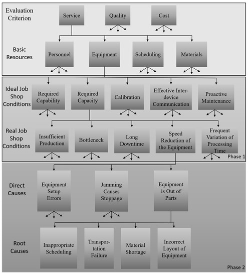 As shown in Figure 3, equipment in ideal job shop conditions based on service are required capability and capacity, calibrated, effective inter-device communication, and proactive maintenance. However, in the actual environment, the opposite of having the required capacity is the resulting problems such as insufficient production, bottleneck, long downtime, speed reduction of equipment, and frequent variation of processing time. Among them, taking the speed reduction of the equipment as an example, the direct causes include equipment setup errors, jamming causes stoppage, being out of parts, etc. The root causes of being out of parts include inappropriate scheduling, transportation failure, material shortage, and incorrect layout of equipment.