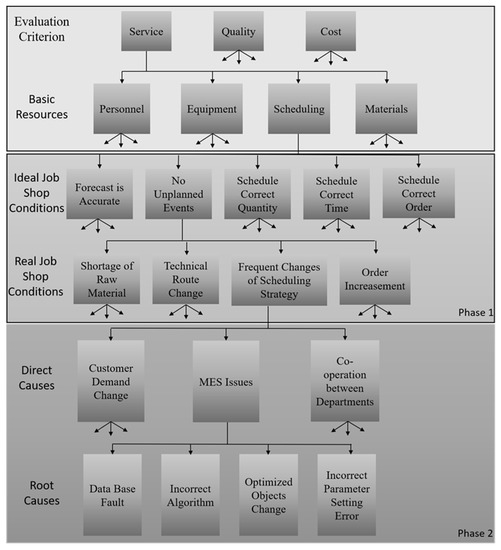 It can be seen from Figure 4 that based on the criteria of service, scheduling in an ideal job shop condition is manifested as accurate forecast, correct quantity and time, etc. However, in the actual environment, what is opposite to no unplanned events is the phenomenon of shortage of raw material, technical route change, frequent changes of scheduling strategy, and order increasement. Among them, taking the frequent changes of scheduling strategy as an example, the direct causes include customer demand change, MES issues, cooperation between departments, etc. The root causes of manufacturing execution system (MES) issues include data base fault, incorrect algorithm, changes of optimized objects, parameter setting error, etc.