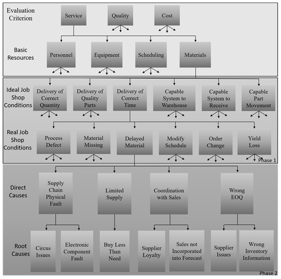 As shown in Figure 5, the material in ideal job shop conditions based on service is the delivery of correct quantity, delivery of quality parts, delivery of correct time, etc. However, in the actual environment, the opposite of delivery of correct time is the resulting problems such as process defect, material missing, delayed material, etc. Among them, taking the delayed material as an example, the direct causes include supply chain physical fault, limited supply, coordination with sales, and wrong economic order quantity (EOQ). The root causes of the wrong EOQ include supplier issues and wrong inventory information, etc.