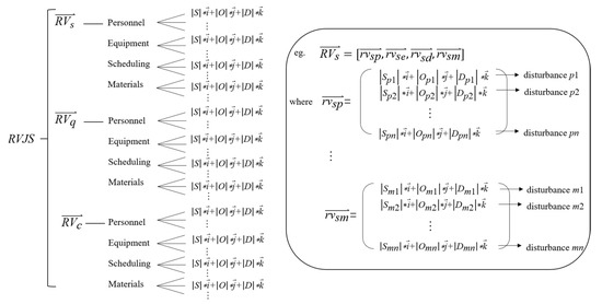 where represents job shop disturbance risk vector. represent service disturbance vector, quality disturbance vector, and cost disturbance vector, respectively. are the personnel, equipment, scheduling, and material disturbance vector related to the service. Similarly, are the personnel, equipment, scheduling, and material disturbance vector related to the quality. correspond to the resource disturbance vectors related to the cost. Service-, quality-, and price-related disturbance vectors (Equations (7)–(9)) are the set of individual disturbance vectors, while job shop disturbance vector (Equation (6)) is the set of service-, quality-, and cost-related disturbance vectors. The logical relationship is shown in Figure 6.