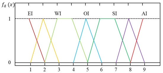 where is the fuzzy relative importance by comparting index i with index j provided by eth expert. The fuzzy corresponding number for relative importance and membership function are shown in Table 3 and Figure 7.