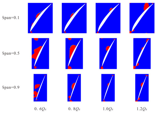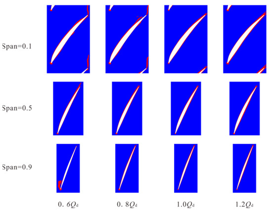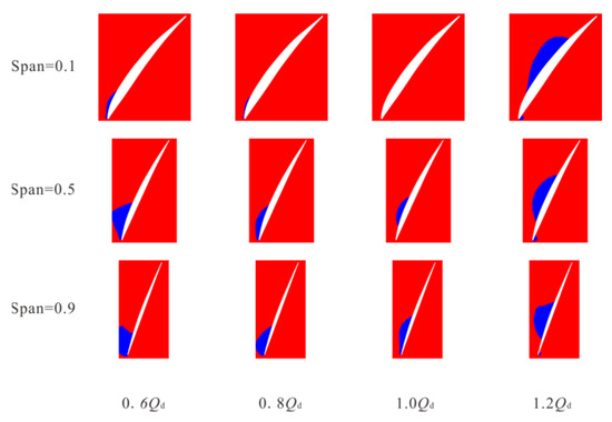 - The distribution rule of the areas below the pressure threshold, beyond the shear strain rate threshold and beyond the pressure gradient threshold in the impeller and under different working conditions were obtained. The findings however revealed that the areas below the pressure threshold in the impeller were commonly distributed at the back of the blade near the inlet. It is worth observing that the regions exceeding the shear strain rate threshold in the impeller are mainly distributed on the blade surface, hub surface, and rim surface. Meanwhile, the regions exceeding the pressure gradient threshold were mainly distributed near the blade inlet edge, the middle of the flow passage, and the blade outlet edge.