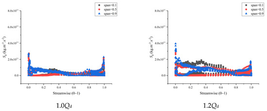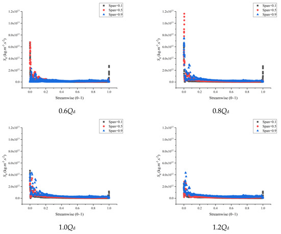 - Finally, the distribution area of the dipole sound source inside the impeller and guide vane changes with the increase of the blade height. Further, the dipole sound source inside the impeller and guide vane decreases first and then increases with the increase of the flow, attaining the lowest at the design condition. Meanwhile, when the impeller blade is closer to the guide blade, the dipole sound source at the exit of the impeller increases. Nonetheless, when the impeller blade is far away from the guide blade, the dipole sound source at this position gradually deteriorates.